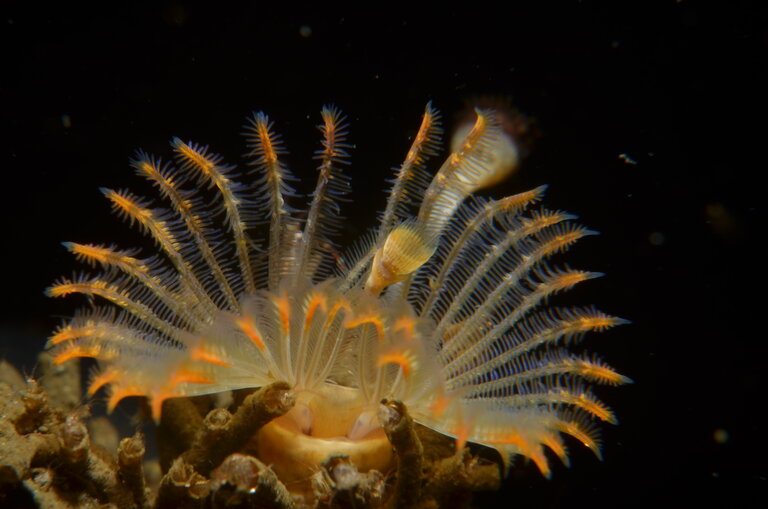 Op de tweede wedstrijddag duiken we 's morgens op Baixa da Cruz. Deze locatie kennen we ondertussen vrij goed, dus we gaan rechtstreeks op ons doel af. We passeren eerst langs de wand met de gele anemoontjes, daarna gaan we nog aan de slag met de vuurwormen die hier in grote aantallen voorkomen.